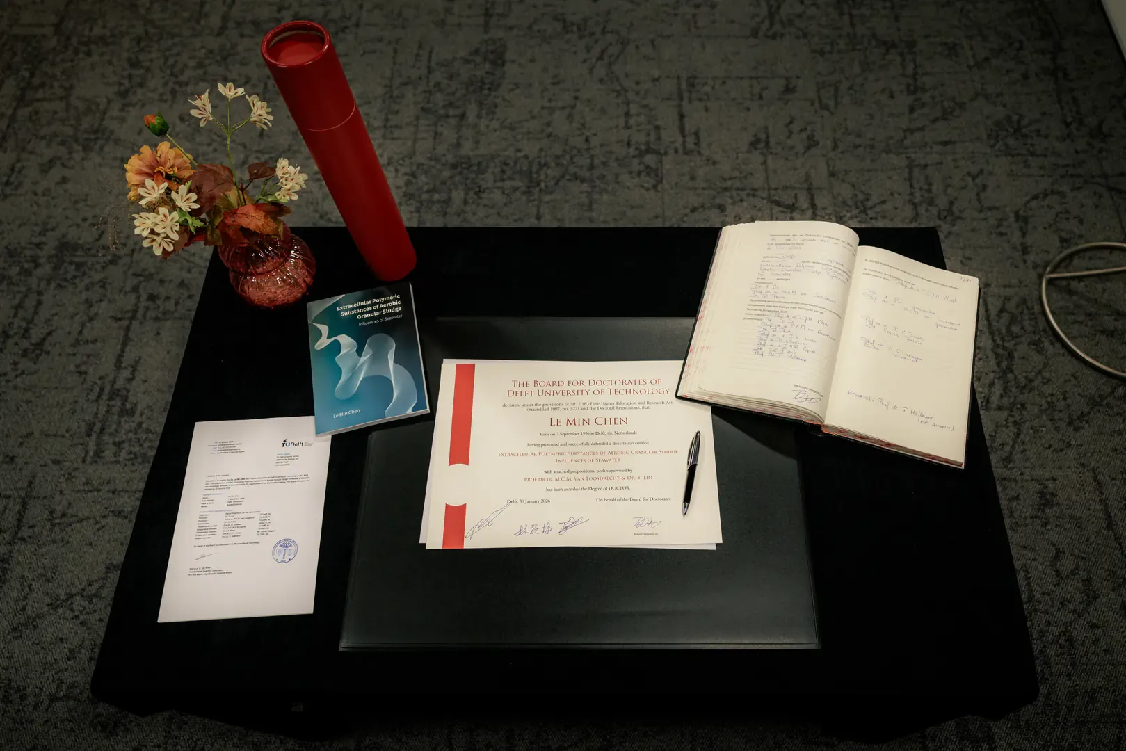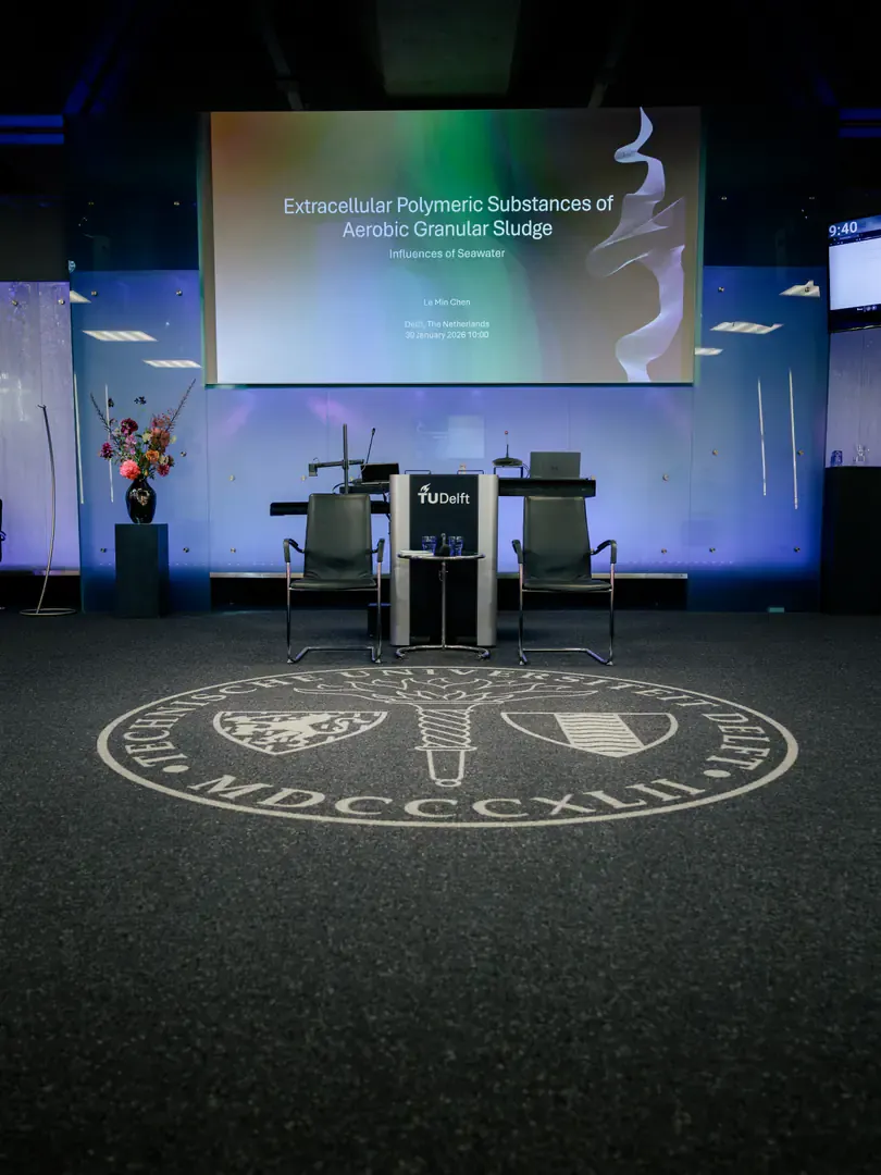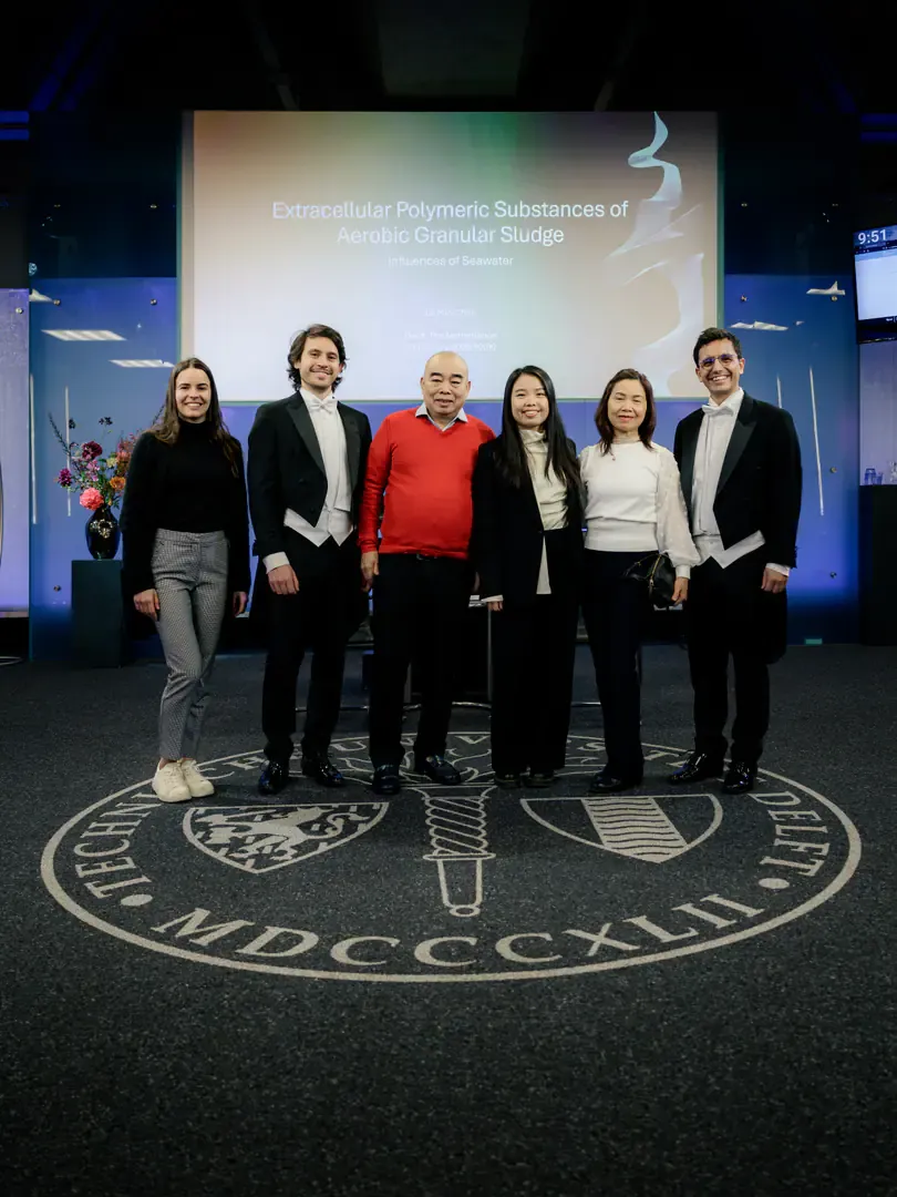 A PhD defence is the ultimate culmination of years of relentless dedication, late-night research, and sheer passion. It’s a profound academic milestone that brings together esteemed colleagues, proud family members, and supportive friends. For Lemin, it was no different. January 2026 marked the big moment for her, to which she had been working for the last four years. The Senate Hall at the top of the Aula at the Technical University of Delft was packed, and for almost an hour, all attention was on her, the committee members and the paranymphs. As was to be expected, tensions were high beforehand, but Lemin defended her thesis on “Extracellular Polymeric Substances of Aerobic Granular Sludge” masterfully, and is now able to proudly wear the title of Doctor.